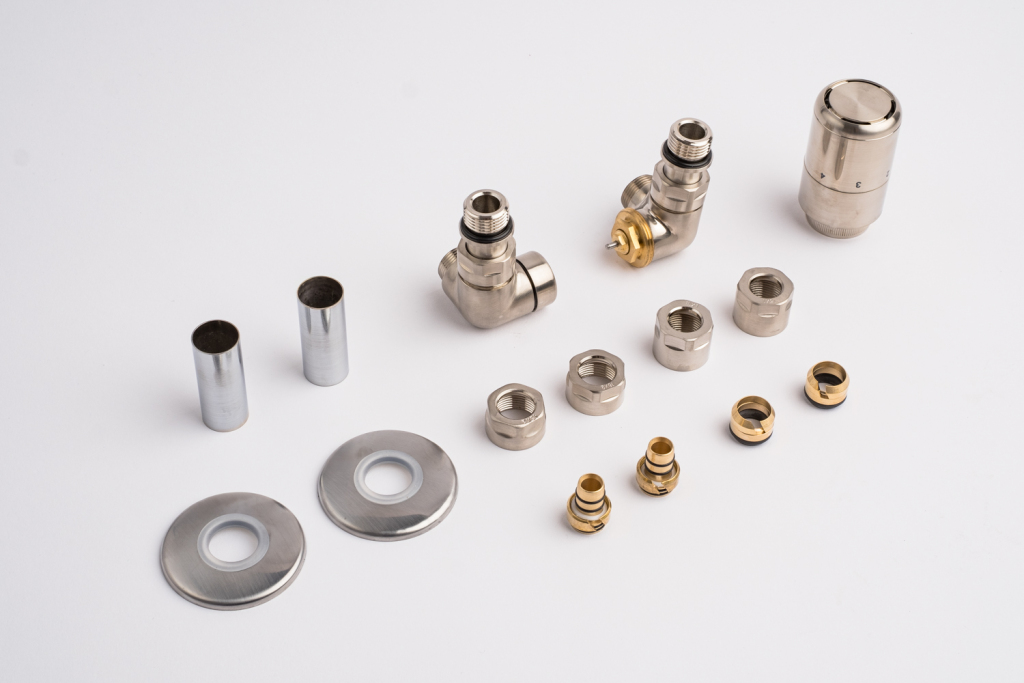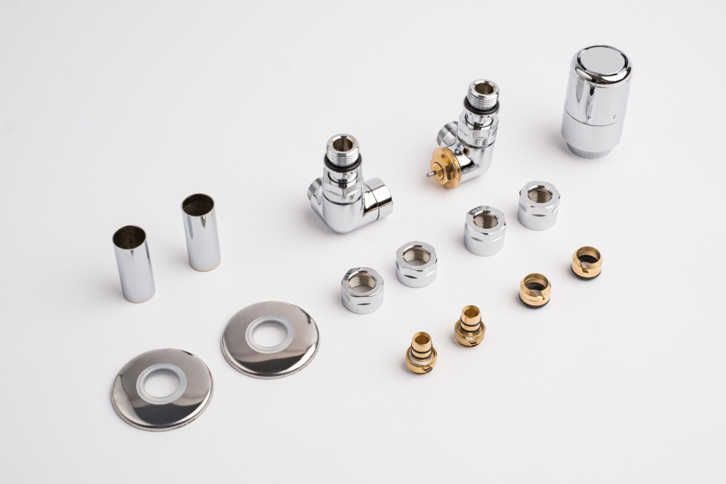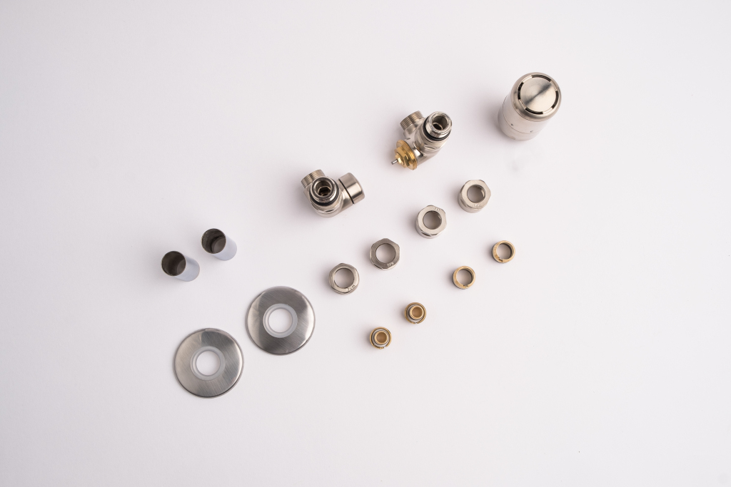 Kompletní sada obsahuje kromě ventilu také krycí rozety a svěrné šroubení pro připojení na měď  15 mm a Alupex 16 mm.